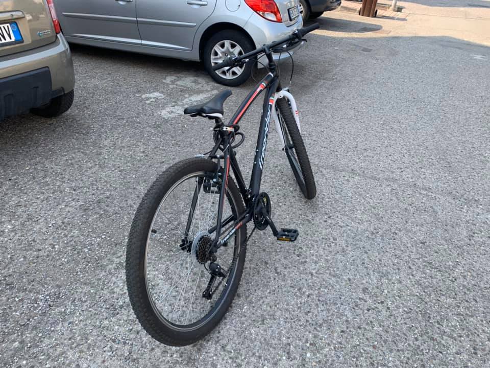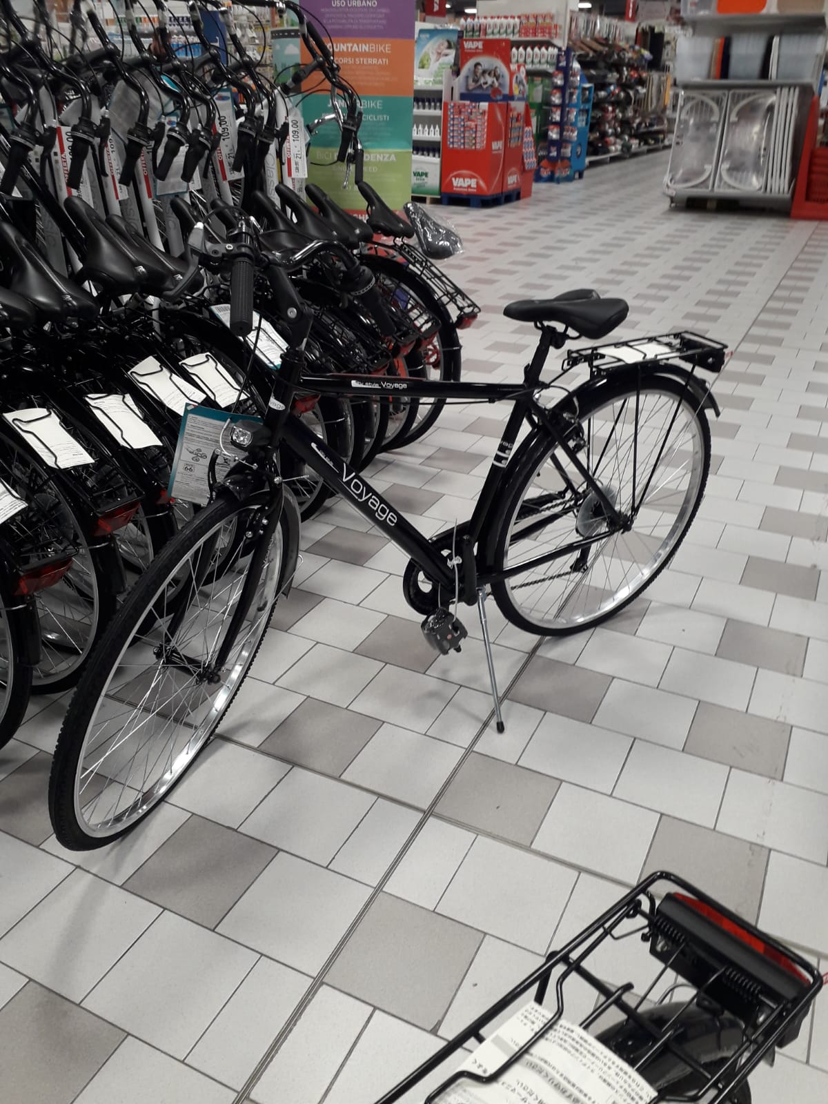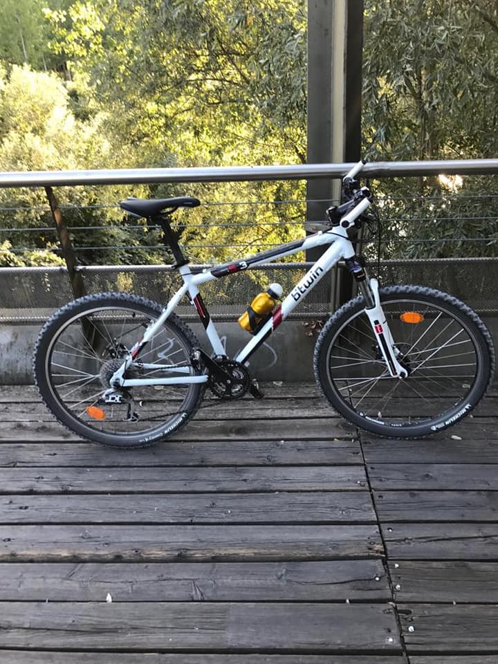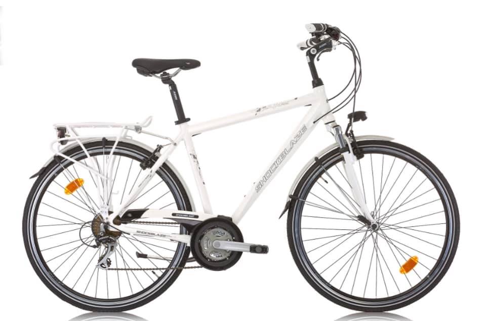 legata alla rastrelliera. La bici è bianca, una city bike da uomo marca shock blaze. ( la scritta sul mio telaio è più evidente di questa nella foro e con colori rosso e nero). Il fanale davanti e quello dietro sono a batteria ma solo quello davanti funziona. L’elastico sul portapacchi è nero, così come il campanello.